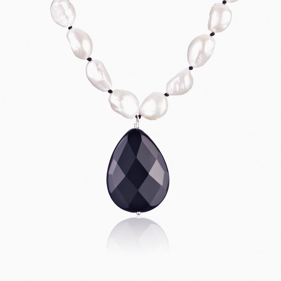 Audrey Baroque Pearl Necklace with Black Agate drop.