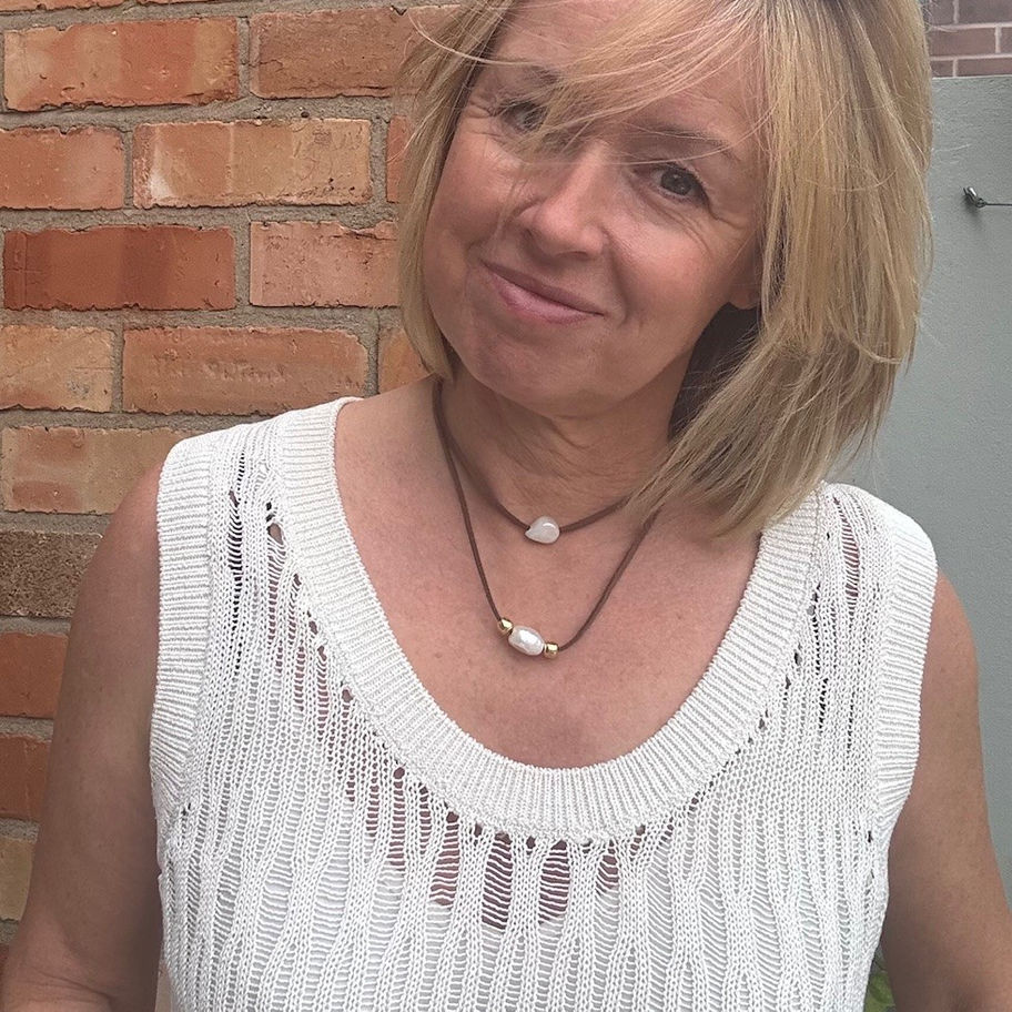 Audrey has been created from a gorgeous baroque pearl and gold plated nuggets, strung onto imitation suede for a contemporary look. Although this is designed to be a short necklace, the gold stopper bead does allow adjustments for different necklines.
