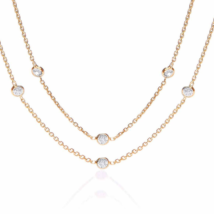 The Elenore is a longer option to the Claudia, at 38" , giving you the versatility to double up or wear long. This "diamond by the yard" look necklace has been created from gold plated silver chain with 23 bezel set cubic zirconia let in to the chain.