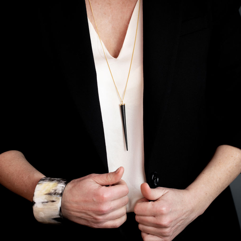 Layer with shorter necklaces or as a single statement. This hand made rounded end spike pendant has a gold cap and hangs from a 30" gold plated silver chain.
