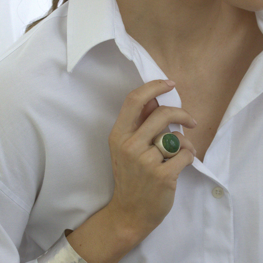The Kim ring has a beautiful soft domed round shape. The sterling silver ring is set with a stunning green African Jade - which is actually, according to geologists, is a type of garnet.