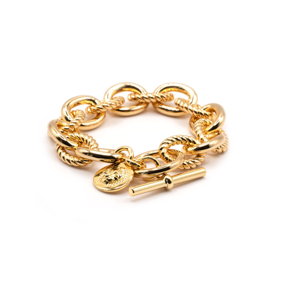 The Manon link bracelet has been created from alternate smooth and textured twist links. It is has a T-Bar fastening with gold disk featuring a lions head.