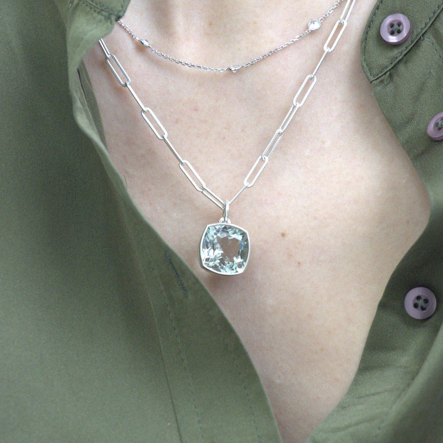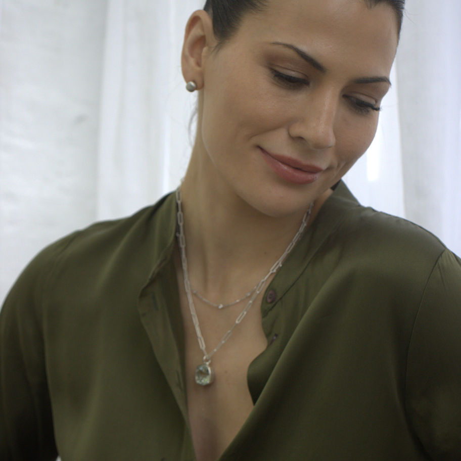 Manon is a stunning 12.36 crt (15mmx15mm) facetted green amethyst is a one and only! It has been handset in a beautiful sterling silver setting, which has been created as a one off to fit this stone and is open at the sides, to allow the light to pass through the stone and illuminate the facets. The wonderful rectangular link chain has a wonderful textured surface, its 20" in length. The open link means the necklace can be shortened to adjust to your neckline. This really is one of kind! Very special piece.