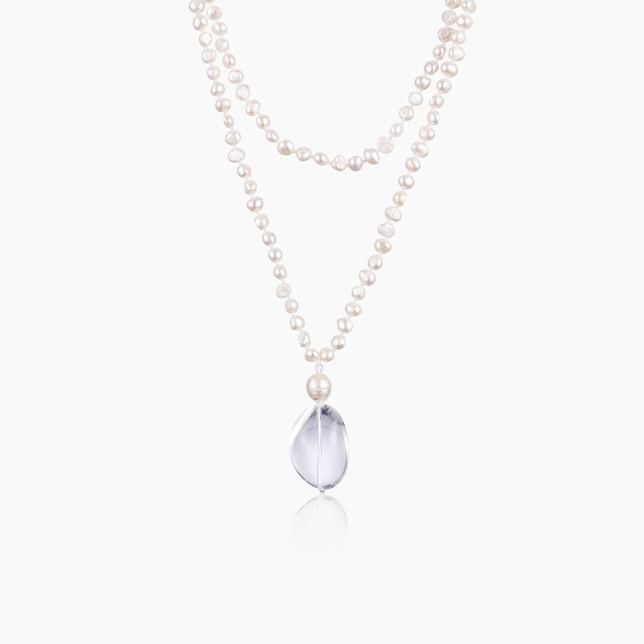 Nadia is an elegant necklace of layered freshwater pearls with a smooth rock crystal dropper.