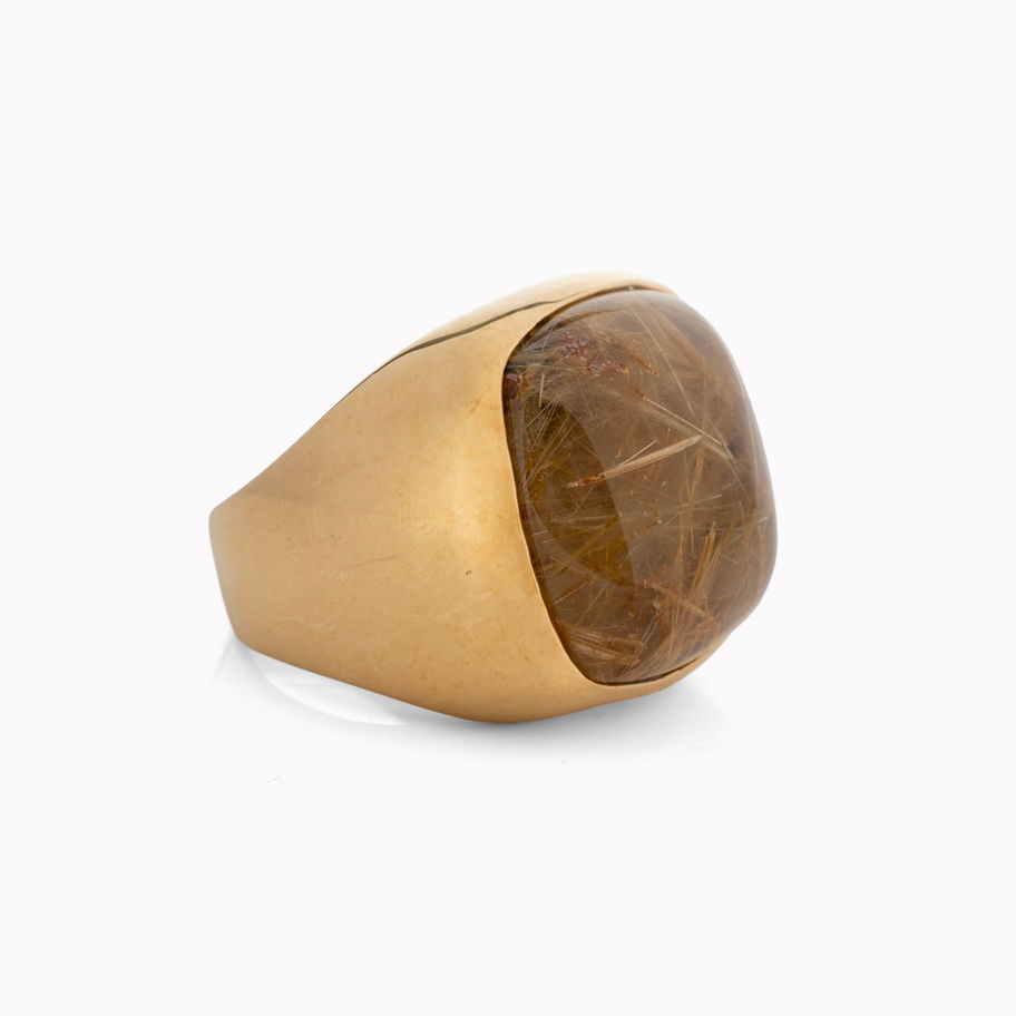 Nikki is stunning statement ring. This gold ring has been set with Rutile Quartz; which is a beautiful gold coloured stone with almost strands of gold within it. The soft square shape makes it comfortable to wear, as well as striking.