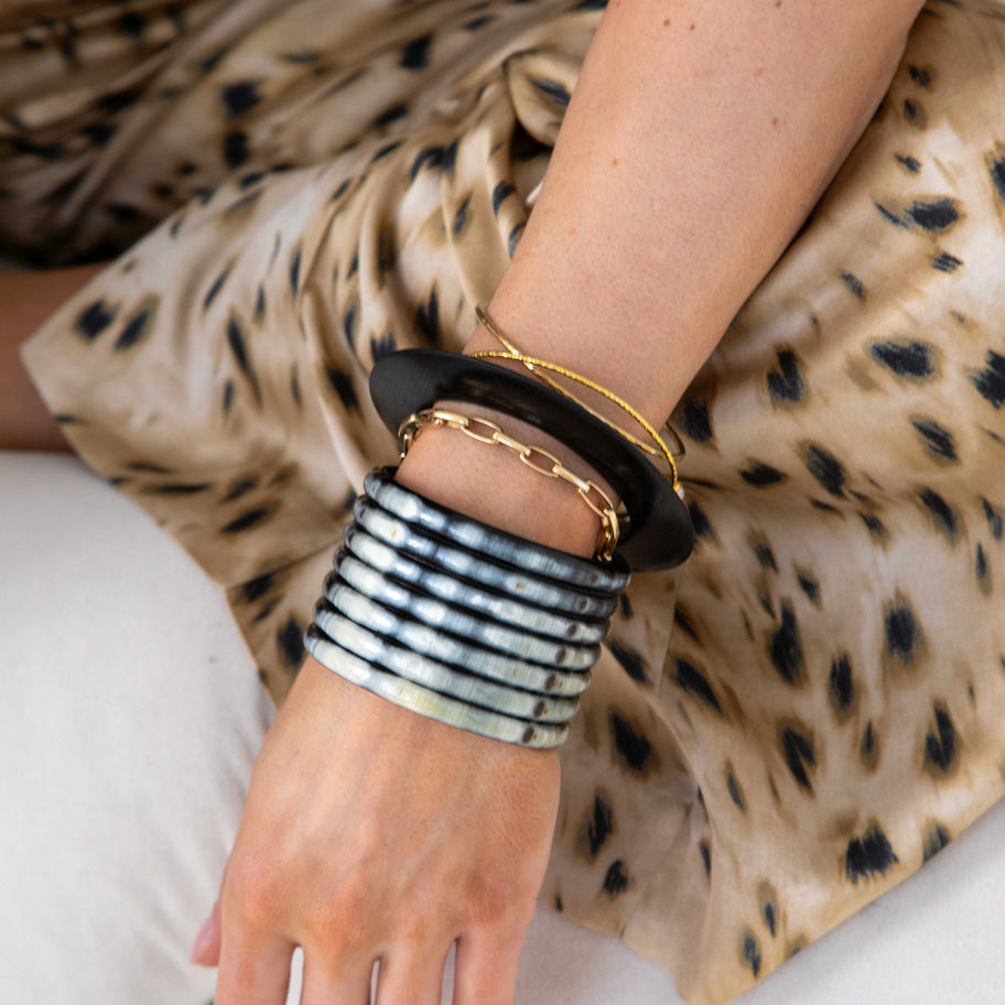 This natural horn cuff by Branch Jewellery, has been ethically sourced and handmade by small workshops in rural Vietnam using traditional method and supporting local communities with income through manufacturing and fair trade. The buffalo horn is 100% a bi-product.